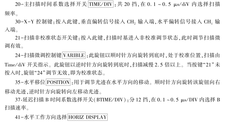 示波器操作:再次将X-Y 控制键“30”按下(即该键弹起),便实现非X-Y 状态(即由扫描发生器在X 轴偏转板上自动加一扫描电压)。