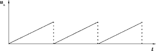 将加到Y 偏转板上的电压信号,在显示屏上展开成为函数曲线图形的过程称为扫描,获得扫描的方法是在X1X2 偏转板上加的与时间成正比增加的周期性电压信号,这个周期性变化的锯齿形的电压称为扫描电压,如图4.13 所示。 扫描电压由扫描发生器提供。