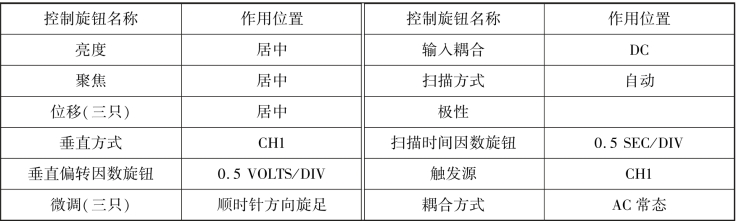 ①熟悉示波器各旋钮的作用,按表4.4 设置示波器的开关及控制旋钮或按键。