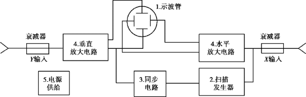 示波器由示波管、扫描发生器、同步电路、水平轴和垂直轴放大器以及电源5 部分组成,如图4.9 所示。