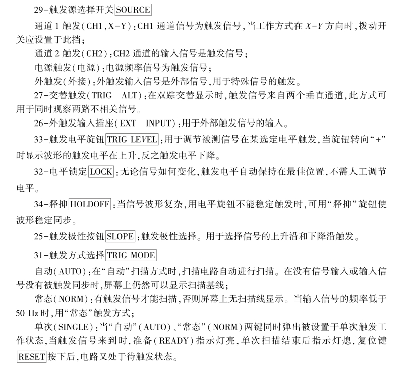 ③实现同步(保持扫描电压信号周期Tx 为待测正弦波电压信号周期Ty 的整数倍,即Tx=nTy)。 示波器操作:调节触发电平控制选钮“33”到适当位置,此时在示波器显示屏上便可观察到一条稳定的正弦波形线(当触发方式选择“31”的自动键和常态键均按下时,示波器工作在锁定状态下,此时无须调节触发电平即可自动实现同步)。
