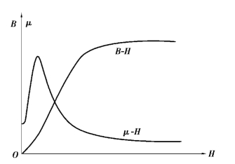图4.27 铁磁质材料的B-H 和μ-H 并系曲线