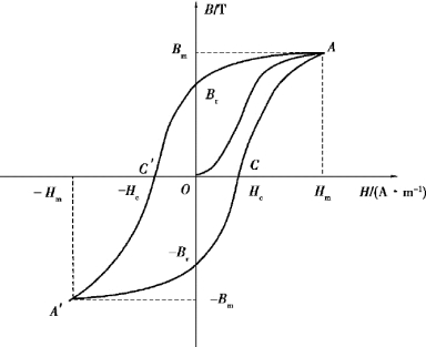 曲线OA 表示铁磁材料从没有磁性开始磁化,B 随H 的增加而增加,称为(初始)磁化曲线。 当H 值到达某一个值Hm 时,B 值几乎不再增加,磁化趋于饱和,这时铁磁质的磁化状态称为磁饱和状态;如果使H 减少,B 不会沿着原路返回,而是沿另一条曲线AC′A′下降,即铁磁质的磁化过程不可逆;当H 从-Hm 增加时,B 将沿着A′CA 曲线到达A 形成一闭合曲线,即磁滞回线。 其中当H 由Hm 减小到0 时,B 由Bm 减小到Br,Br 称为剩磁。 要使得B 为零,就必须加一反向磁场,当反向磁场强度增加到H=-Hc 时,磁感应强度B 由Br 减小为零,这个过程称为退磁,Hc 称为矫顽力。 各种铁磁材料有不同的磁滞回线,主要区别在于矫顽力的大小,矫顽力大的称为硬磁材料,矫顽力小的称为软磁材料。