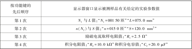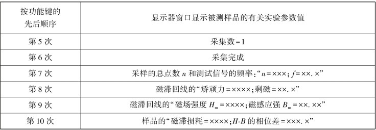 开机或复位后,输出液晶显示器窗口显示“欢迎使用磁滞回线测试仪”,之后依次按功能键,显示器窗口显示被测样品有关给定的实验参数值,详见表4.12。
