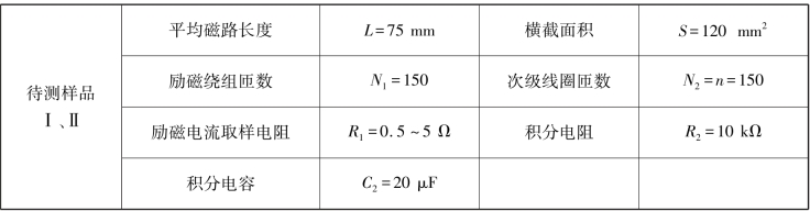 样品Ⅰ和样品Ⅱ均采用EI 形(指变压器铁芯形状一片是E 形、一片是I 形)铁芯,其尺寸(平均磁路L 和截面积S)相同,但磁导率不同。 两者的励磁绕组匝数N1 和测量绕组的匝数N2 也相等。 参数值详见表4.9。