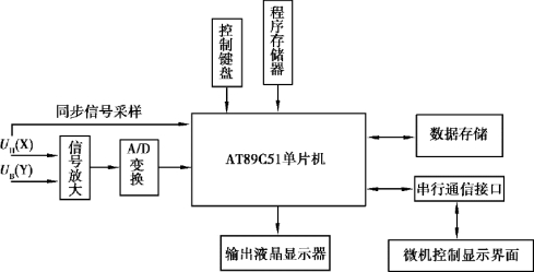 测试仪由两路输入信号(UB、UH)放大、两路信号数据采集、同步信号采样、数据存储、单片微机控制器(AT89C51 或89C52)及数据采集处理软件、控制键盘、输出液晶显示器、串行通信接口等组成,其结构框图如图4.32 所示。 测试仪面板如图4.33 所示,显示输出选用点阵式液晶显示器。