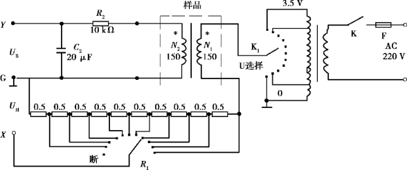 由变压器对220 V、50 Hz 市电进行隔离、降压后,提供样品的磁化电压,共分11 挡,即0、0.5、0.9、1.2、1.5、1.8、2.1、2.4、2.7、3.0 和3.5 V,通过波段开关可选择不同的磁化电压。