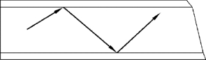 光导纤维是利用光的完全内反射原理传输光波的一种介质。 如图5.7 所示,它是由高折射率的纤芯和包层组成。 包层的折射率小于纤芯的折射率,直径为0.1 ~0.2 mm。 当光线通过端面透入纤芯,在到达与包层的交界面时,由于光线的完全内反射,光线反射回纤芯层。 这样经过不断地反射,光线就能沿着纤芯向前传播。