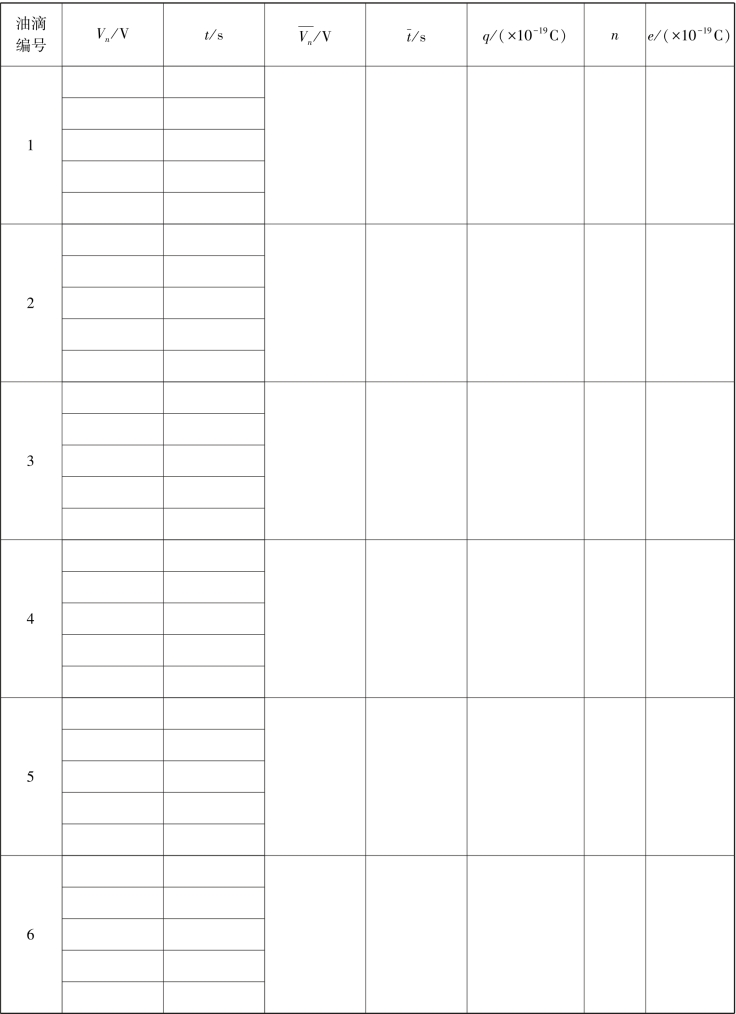 将式(5.26)所得数据除以电子电荷的公认值e=1.602×10-19C,所得整数就是油滴所带的电荷数n,再用n 去除实验测得的电荷值,就可得到电子电荷的测量值。 对不同油滴测得的电子电荷值不能再求平均值。