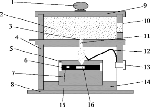 1—油雾室提把;2—油雾室;3—油雾孔开关;4—油滴盒防风罩;5—铝质上电极;6—上下电极绝缘电圈;7—铝质下电极;8—油滴仪托板;9—油雾室上盖;10—油滴喷雾口;11—油雾孔;12—上电极压簧;13—上电极电源的插孔;14—滴盒室绝缘座;15—照明孔;16—漫反射屏