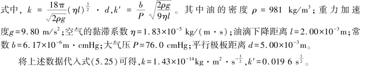 式(5.19)根号下虽然还包含油滴的半径r,因为它是处于修正项中,不需要十分精确,仍可用式(5.18)来表示。 将式(5.19)代入式(5.17)得