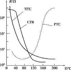 热敏电阻是电阻值随温度显著变化的一种热敏元件。 热敏电阻按其电阻随温度变化的典型特性可分为3 类,即负温度系数(NTC)热敏电阻、正温度系数(PTC)热敏电阻和临界温度电阻器(CTR)。 PTC 和CTR 型热敏电阻在某些温度范围内,其电阻值会产生急剧变化,适用于某些狭窄温度范围内的一些特殊应用,而NTC 热敏电阻可用于较宽温度范围的测量。 热敏电阻的电阻-温度特性曲线如图5.28 所示。