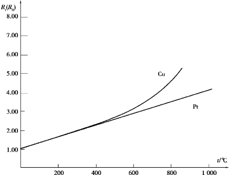 铜电阻和铂电阻的阻值变化率与温度之间的关系如图5.27 所示。
