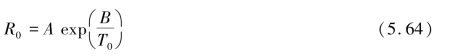 式(5.63)中,RT 为在温度为T 时的电阻值,T 为绝对温度(以K 为单位),A 和B 分别为具有电阻量纲和温度量纲,并且与热敏电阻的材料和结构有关的常数。 由式(5.63)可得到温度为T0 时的电阻值R0,即