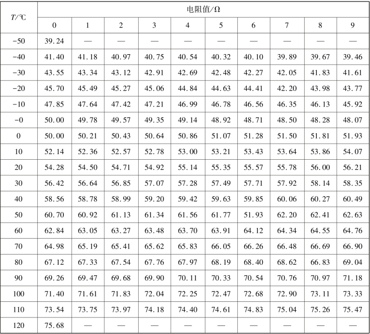 铂电阻电阻率ρPt=9.81×10-8Ω·m,在0 ~650 ℃内其阻值用式(5.60)表示