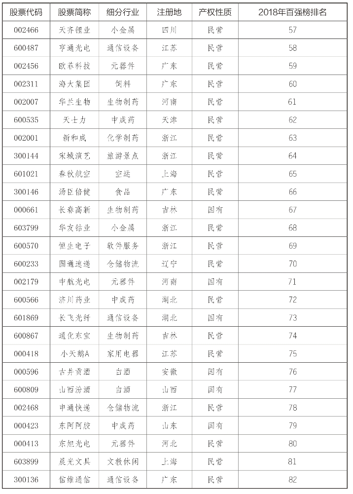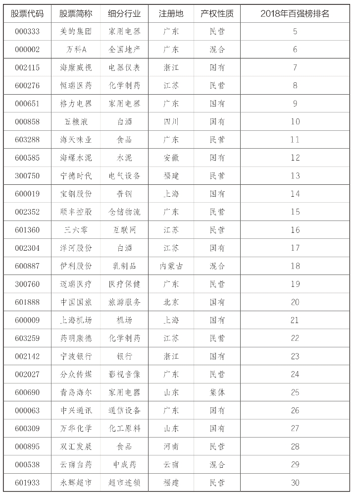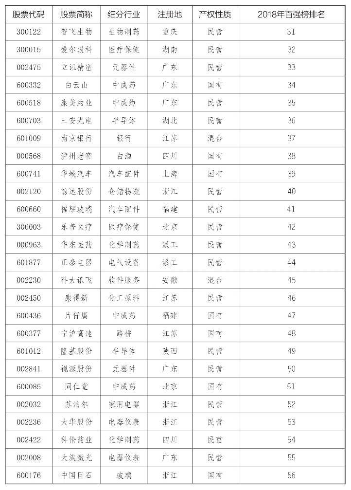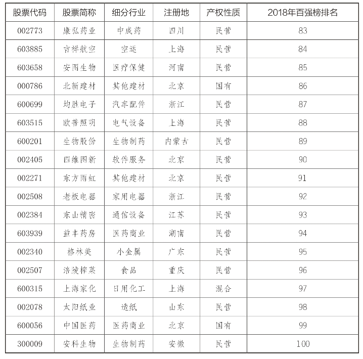 “2018中国上市公司最具竞争力企业100强”榜单(见表1):