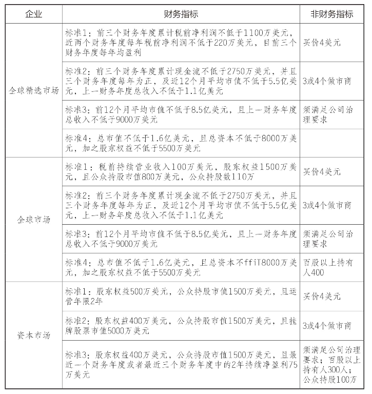 从制度来看:科创板虽然在交易制度、市场分层、上市标准、退市制度、投资者准入门槛等方面已有了重大改革,但相对纳斯达克还不够市场化和开放。例如,交易制度方面,纳斯达克采用多做市商交易制度,且电子交易在55个国家和地区设有26万余个计算机销售终端,纳斯达克上市标准见表2。科创板以竞价交易,20%涨跌幅,上市后前5天不设涨跌幅限制,盘后固定价格交易。