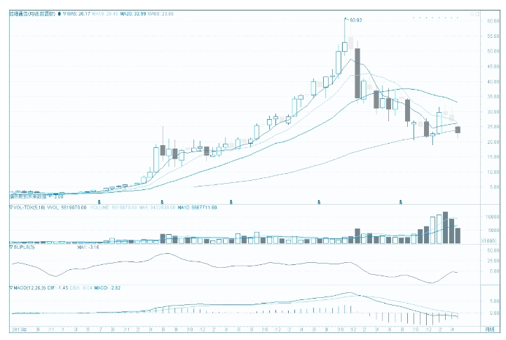 如图64所示,2013年信维股份(300136)产品切入苹果手机产业链,注定股价大涨。随着智能手机的快速扩张,公司收益必然大幅增长。股价(前复权)从2元涨到60元。