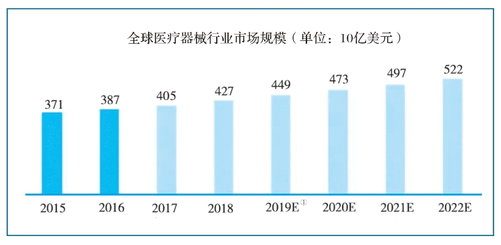 如图65所示,根据Evaluate Med Tech统计,2016年,全球医疗器械销售规模为3870亿美元,预计到2022年,全球医疗器械市场规模将超5200亿美元,期间复合增长率保持在5.1%。