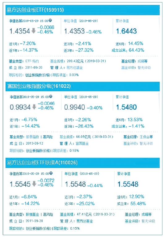 从创业板的指数基金规模来看,前三名为:易方达创业板ETF(159915)、富国创业板指数分级(161022)、易方达创业板ETF联接A(110026)。