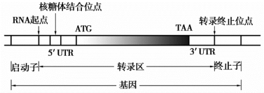 原核生物的单个基因平均为1 000 bp左右,而真核生物的单个基因平均由7 000~8 000 bp组成。一条DNA分子可以包含多至几千个基因。基因由多个不同的区域组成。无论是原核生物基因还是真核生物基因,都可划分为转录区和调控区两个基本组成部分。转录区为转录起始点至转录终止点的区域,其中,从5′端至3′端顺序排列依次为:5′端非翻译区(5′UTR)、翻译起始密码(通常是AUG)、连续排列的密码子区(真核生物基因的这个区域为可翻译的外显子和不可翻译的内含子间隔排列)、终止密码(UAA或UAG或UGA)、3′端非翻译区(3′UTR)。转录的调控区位于转录起始位点5′上游,包含核心启动子、上游启动元件以及增强子等序列。