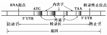 如图2-2和图2-3所示,原核基因与真核基因的结构组成大体相似,它们的转录都开始于启动子,终止于终止子。但是真核生物基因结构更复杂一些,其编码序列往往是不连续排列的,由外显子和内含子间隔排列,因此真核生物的基因有时也被称为间隔基因(splitting gene)或断裂基因(interrupted gene)。其中,外显子是指基因内编码蛋白质的DNA序列或可被翻译的序列或与成熟mRNA对应的序列。内含子是指基因内不编码蛋白质的DNA序列或可转录但不被翻译的序列或与成熟mRNA不对应的序列。不同的基因中内含子数目不等。第一个外显子紧邻5′UTR下游,最后一个外显子紧邻3′UTR上游。