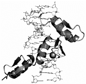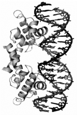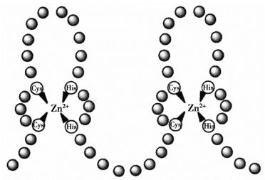 DNA上的特定调控序列可以与相应的调控蛋白结合。这些蛋白质在真核生物中统称为转录因子,在原核生物中,这些蛋白质依其作用性质分为阻遏蛋白、激活蛋白和特异因子。阻遏蛋白与操纵序列结合,阻止基因的转录起始。激活蛋白与启动子前的正控制调控序列结合,促进转录的起始。真核生物中的转录因子以反式作用方式与顺式作用元件结合,调节转录活性,所以这些因子也被称为反式作用因子。上述DNA—蛋白质之间的结合通常以非共价键的形式实现,通过蛋白质分子中具有特殊结构的功能域与DNA分子双螺旋结构中的大沟结合来调节基因的转录。这些功能域常见的结构特征有如下两种。