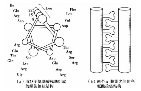 (1)亮氨酸拉链结构 亮氨酸拉链结构是指在调控蛋白的肽链中,每隔7个氨基酸残基就有一个亮氨酸残基,这段肽链所形成的α-螺旋会出现一个由亮氨酸残基组成的疏水面,而另一面则是由亲水性氨基酸残基构成的亲水面。由亮氨酸残基组成的疏水面即为亮氨酸拉链条,两个具有亮氨酸拉链条的反式作用因子,就能借疏水作用形成二聚体,如图2-11所示。在具有亮氨酸拉链结构的调节蛋白中,行使与DNA结合这一功能的是“拉链”区以外的结构,亮氨酸拉链结构对二聚体的形成是必需的。