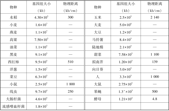 低分辨率物理图谱在人类基因组计划中本身是独立的部分,但从染色体区带—表达基因区域—遗传学距离—物理学实际距离—碱基序列这一过程来看,低分辨率染色体分带可看作粗略的物理图谱,碱基序列则是最精密的物理图谱。低分辨率图谱上的一些路标常常被用在高分辨率图谱的构建中,结合其他路标形成高密度路标分布的图谱,同时这些高密度路标可以重新在低分辨率图谱进行验证,形成高分辨率与低分辨率相结合的整合物理图谱。每种图谱都有各自的优缺点,所以即使对同一基因组进行研究,不同的实验室可能会采用不同的作图方法,但最终各种图谱的结果应能统一起来,相互补充和完善。表3-1列出了部分物种基因大小和遗传/物理距离的关系。