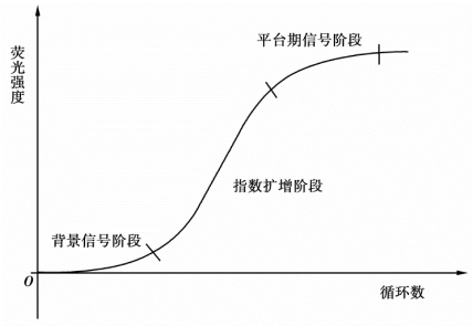 一般而言,荧光扩增曲线可以分成三个阶段:荧光背景信号阶段、荧光信号指数扩增阶段、平台期信号阶段。在荧光背景信号阶段,扩增的荧光信号被荧光背景信号所掩盖,我们无法判断产物量的变化。而在平台期信号阶段,扩增产物已不再呈指数增加。PCR的终产物量与起始模板量之间没有线性关系,所以根据最终的PCR产物量不能计算出起始DNA拷贝数。只有在荧光信号指数扩增阶段,PCR产物量的对数值与起始模板量之间才存在线性关系,我们可以选择在这个阶段进行定量分析。