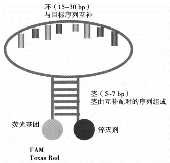 分子信标是一种在靶DNA不存在时形成茎环结构的双标记寡核苷酸探针。在此发夹结构中两端的序列互补,因此位于探针一端的荧光基团与探针另一端的淬灭基团紧紧靠近。在此结构中,荧光基团被激发后不是产生光子,而是将能量传递给淬灭剂,这一过程被称为荧光谐振能量传递。由于“黑色”淬灭剂的存在,由荧光基团产生的能量以红外光而不是可见光形式释放出来。如果第二个荧光基团是淬灭剂,其释放能量的波长与荧光基团的性质有关,常用的荧光基团有FAI和Texas Red。