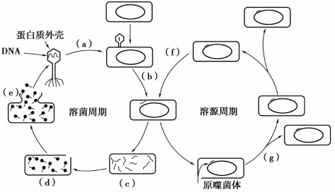 (a)噬菌体增殖的第一步是吸附到寄主细胞上,同一个细胞可以同时吸附一个以上的噬菌体颗粒;(b)噬菌体的DNA注入感染的寄主细胞内;(c)噬菌体DNA大量增殖;(d)子代噬菌体颗粒的组装;(e)寄主细胞溶菌,释放出大量新的噬菌体颗粒;(f)噬菌体的DNA从寄主染色体DNA上删除下来;(g)溶源性细胞通常按照正常细胞的速率进行分裂。