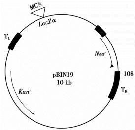 利用T-DNA可携带外源DNA片段并整合到植物基因组的特性,经对天然Ti质粒的改造,构建用于植物遗传转化的表达载体,这类载体可分为一元载体和双元载体等类型。