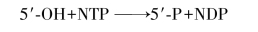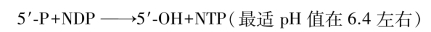 T4多聚核苷酸激酶的激酶活性是,可以催化ATP的γ-位磷酸基团向单链或双链DNA、RNA、寡核苷酸或带有3′磷酸基团的单核苷酸的5′羟基转移。它是一种多聚核苷酸5′-OH激酶,对其他NTP也可产生相同的反应: