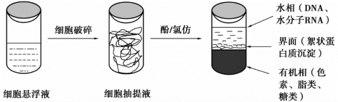 核酸纯化最关键的步骤是去除蛋白质,要将核酸与紧密结合的蛋白质分开,而且还要避免核酸降解。从细胞裂解液等复杂的分子混合物中纯化核酸,则要先用某些蛋白水解酶消化大部分蛋白质后,再用有机溶剂抽提。从核酸溶液中去除蛋白质常用酚/氯仿抽提法,这个方法的基本原理是:交替使用酚、氯仿这两种不同的蛋白质变性剂,以增加去除蛋白杂质的效果。因为酚虽可有效地变性蛋白质,但它不能完全抑制RNA酶(RNase)的活性,而且酚能溶解10%~15%的水,从而能溶解一部分poly(A)RNA,因此DNA提取时一般采用饱和酚。克服这两方面的局限,对于RNA提取显得更加重要。为此可混合使用酚与氯仿,氯仿还能加速有机相与液相分层,去除植物色素和蔗糖。在氯仿中加入少许异戊醇的目的在于减少蛋白质变性操作过程中产生的气泡。最后用氯仿抽提处理,是为了去除核酸溶液中的痕量酚。如果下一步骤中酶反应的条件要求严格,最可靠的方法是再用水饱和的乙醚抽提一次,以彻底去除核酸样品中的痕量酚与氯仿,然后在68℃水浴中放置10 min使痕量乙醚蒸发掉。酚/氯仿萃取原理示意图如图8-1所示。