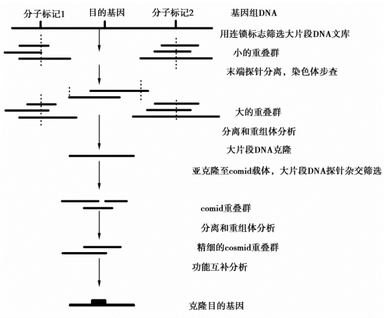 图位克隆法分离首先要有一个根据目的基因的有无而建立起来的遗传分离群体,根据遗传分离组合关系找到与目标基因紧密连锁的分子标记,用遗传作图和物理作图将目标基因定位在染色体的特定位置;然后构建基因组文库,用分子标记筛选文库、染色体步移和亚克隆等手段获得含有目的基因的小片段克隆,再通过遗传转化和功能互补验证,最终确定目标基因的碱基序列。