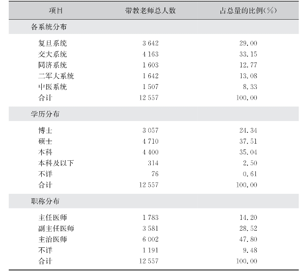 规培医院中,具备带教资格的医师共有12557位。各系统分布方面,复旦和交大系统各占30%左右,同济和二军大系统各占13%左右,中医系统为8%左右。学历方面,研究生学历者及以上学历者占比超过60%,35%为本科学历。职称方面,高级职称者约为43%,中级职称者为48%(表4)。
