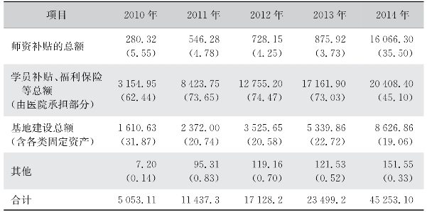 规培医院对住院医师规培工作的经费投入呈逐年增长的趋势,2014年达到4.5253亿元。2010~2013年间,资源投入的70%左右用于在培医师的补贴、福利等,20%左右用于基地建设,对于师资的补贴非常少。2014年,对师资的补贴有大幅的增加(表5)。近5年,医院对规培工作的年平均投入为496.54万元(2010~2013年为37家,2014年为48家)。