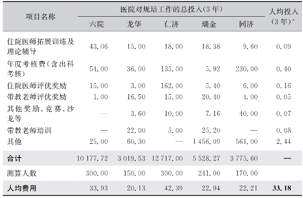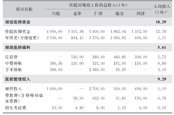 医院对规培工作的投入测算方面,数据来源于上海市5家三级规培医院。医院规培一位住院医师的3年规培期人均投入约为33.18万元(表20)。其中,每位规培医师的奖金(含年终奖)约为18.29万元,福利类收入5.61万元,医院管理类投入9.29万元。计算出规培一位住院医师的年投入平均值为11.06万元/年。