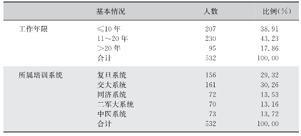 被调查的带教老师中,男性占总人数的44.17%,年龄为25~45岁,硕士及以上学历者占总人数的74.8%(表22)。职称方面,中级职称者为51.8%,高级职称者为42.75%。工作年限方面,11~20年人数最多,占43.23%。来自复旦系统和交大系统的被调查者各占30%,来自其他3个系统的被调查者各占13%左右。