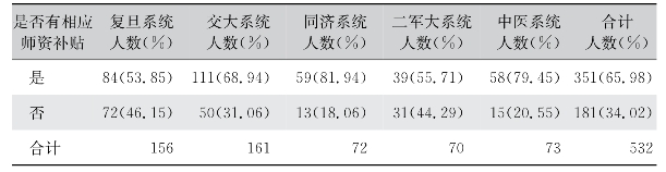 对带教工作进行师资补贴方面,66%的被调查者表示有此类补贴(表30)。不同系统间比较,复旦系统和二军大系统没有相应师资补贴的比例最高,分别为46%和44%,同济系统师资补贴普及程度最高(占82%)。不同系统是否有相应师资补贴情况比较,差异有统计学意义(χ2=33.196,P=0.000)。
