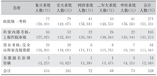 带教老师岗前考核方面,82.6%的被调查者是通过医院或科室统一的考核后获得带教资格的,但有17%的带教老师是通过科室指派或自愿报名的方式上岗,但没有岗前考试(表23)。不同系统之间比较,差异没有统计学意义(P=0.430)。