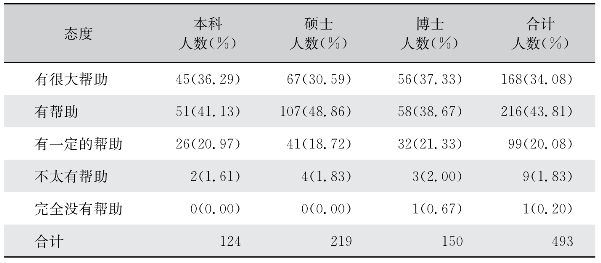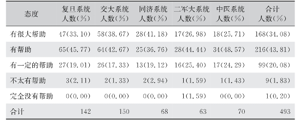 接受过培训的带教老师中,98%的人认为培训对自己的带教工作有一定帮助或有很大帮助。Spearman等级相关分析结果显示学历与带教老师对师资培训的态度无关(ρ=0.000,P=0.998)(表25)。Kruskal-Wallis秩和检验结果显示,各系统带教老师对师资培训的认可态度没有统计学意义(H=6.458,P=0.167)(表26)。