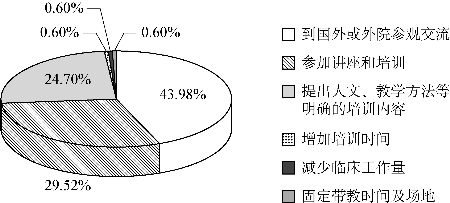 在可能的其他培训方面,44%的被调查者还提出,除医院安排的培训外,应提供到国外或外院参观交流的机会。24.7%的被调查者还提出了在培训内容方面应包括教学理念、具体教学方法、论文指导、英语培训、敏感事务培训、人文培训等(图6)。