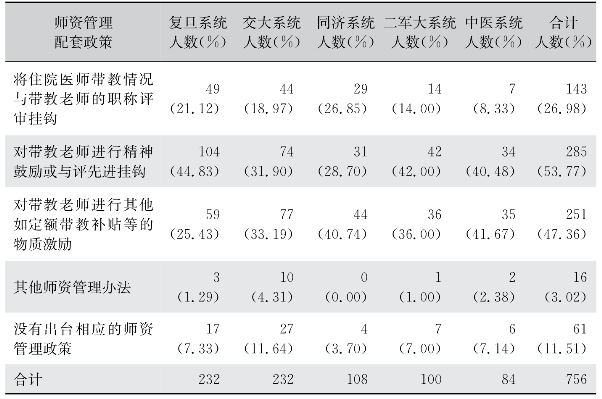 不同系统培训医院出台师资管理配套政策的情况调查显示,交大系统中11.64%的被调查者所在规培机构没有出台相应的师资管理政策,远高于其他系统的被调查者。复旦系统的配套政策主要是将带教工作与“精神鼓励”挂钩;同济系统的配套政策以“物质鼓励”为主;二军大系统和中医系统的配套政策中,既有“物质鼓励”,也有“精神鼓励”(见表27)。各系统之间的配套政策比较,差异有统计学意义(P=0.000)。