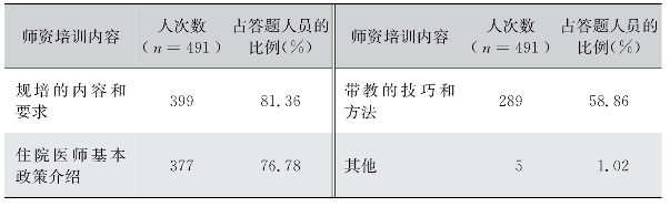 在医院或科室进行的师资培训内容中,“培训的内容和要求”“住院医师基本政策介绍”占80%左右,“带教的技巧和方法”为59%(表24)。