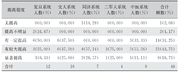 9家被调查规培医院认为自己单位的带教老师在带教能力方面有显著提高。35家医院认为有较大或一定程度的提高。但也有3家医院认为,带教老师的能力提升程度不明显(表53)。Kruskal-Wallis秩和检验结果显示,各系统规培医院对带教老师能力提高程度的评价没有差异(H=4.000,P=0.406)。