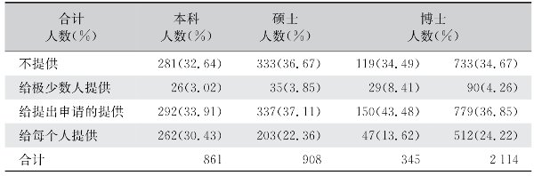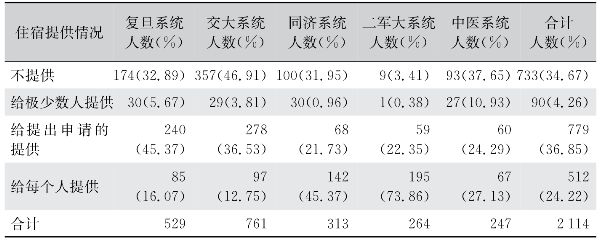 不同系统之间比较,二军大系统中“不提供住宿”的情况仅为4%左右,但是中医系统、交大系统中,该比例为50%。此外,复旦系统该比例为38%,同济系统为33%(表78)。各系统之间的差异有统计学意义。