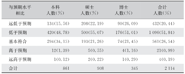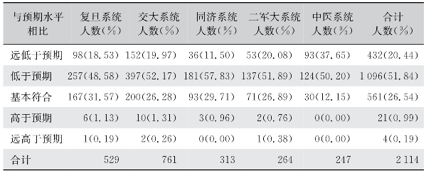 不同系统之间的比较结果显示,中医系统中88%的被调查者认为没有达到自己的预期工资,远高于72%的总体平均水平。复旦系统(67%)和同济系统(69%)的该指标略低于总体水平,而交大系统和二军大系统的该指标与总体水平相当(表80)。统计检验结果显示,各系统之间的差异有统计学意义。