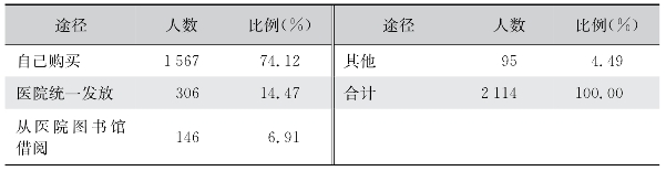 专业书籍和电子文献是住院医师理论知识和科研工作的重要工具,专业书籍的获取途径和电子文献获取的难易程度是住院医师对规培医院培训条件满意程度的一个重要方面。专业书籍获取途径方面,74%的被调查者是“自己购买”,通过医院途径获取的仅占总数的21%(表75)。